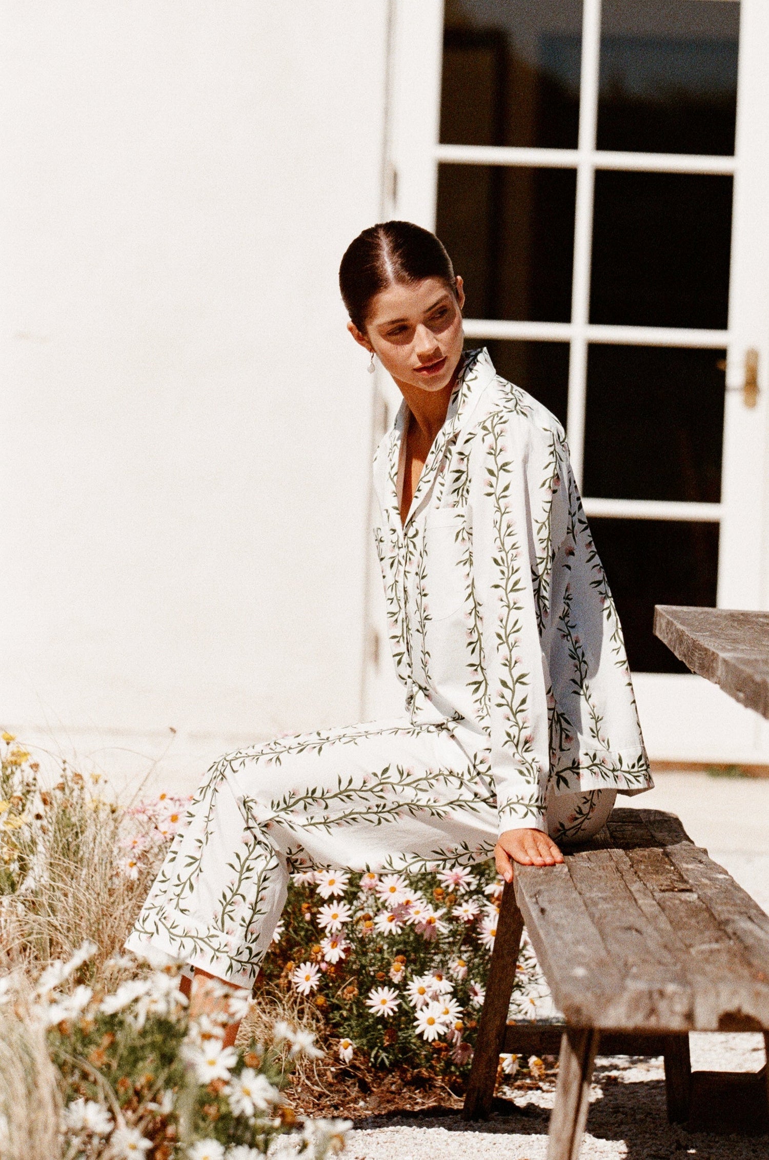 Maggie Pyjama Set - Long Pants - Off White Cotton Modal + Daisy Trim