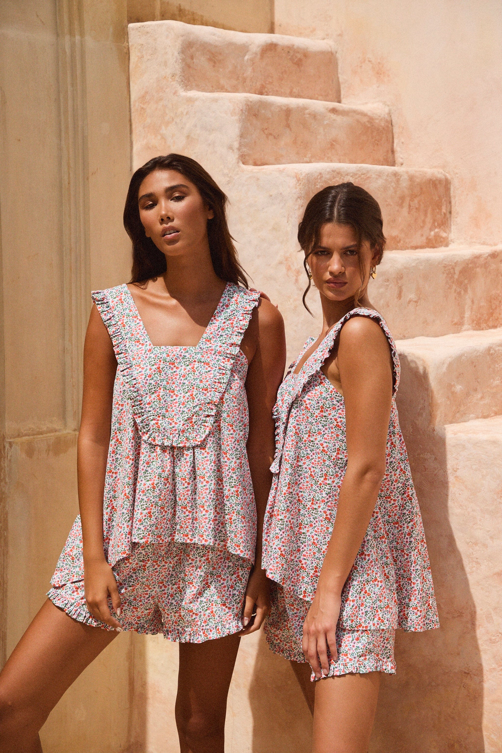 The Elsie Pajama Set has been a beloved popular shape, this time cut in a ditsy floral on our buttery soft 100% cotton. Dress up or down for resort-style comfort.