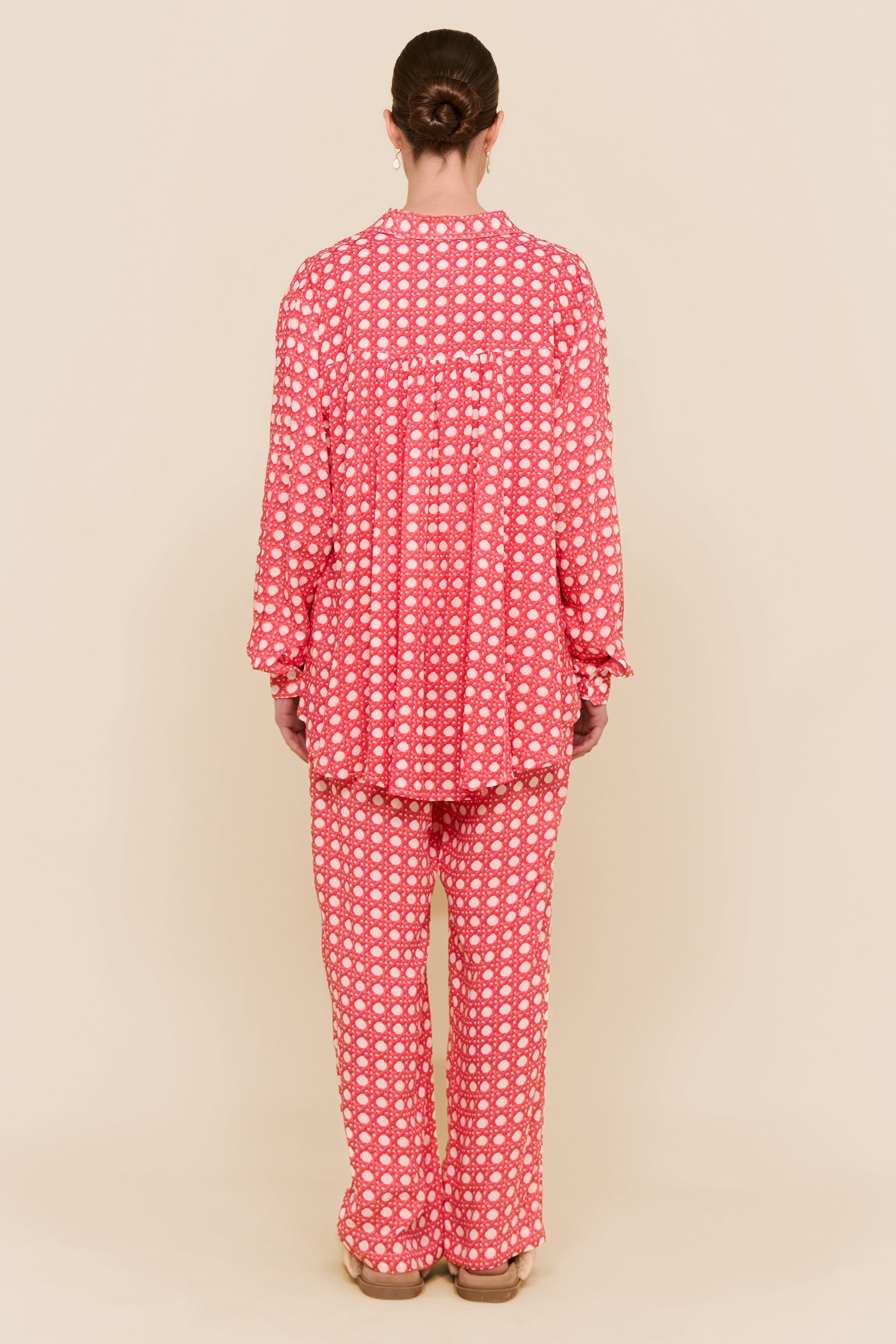 The Marlon Pajama Set is a generously cut boyfriend style top and pants. Hand-crafted in our signature soft 100% rayon. Featuring a classic Rattan motif in a vivid pink hue.