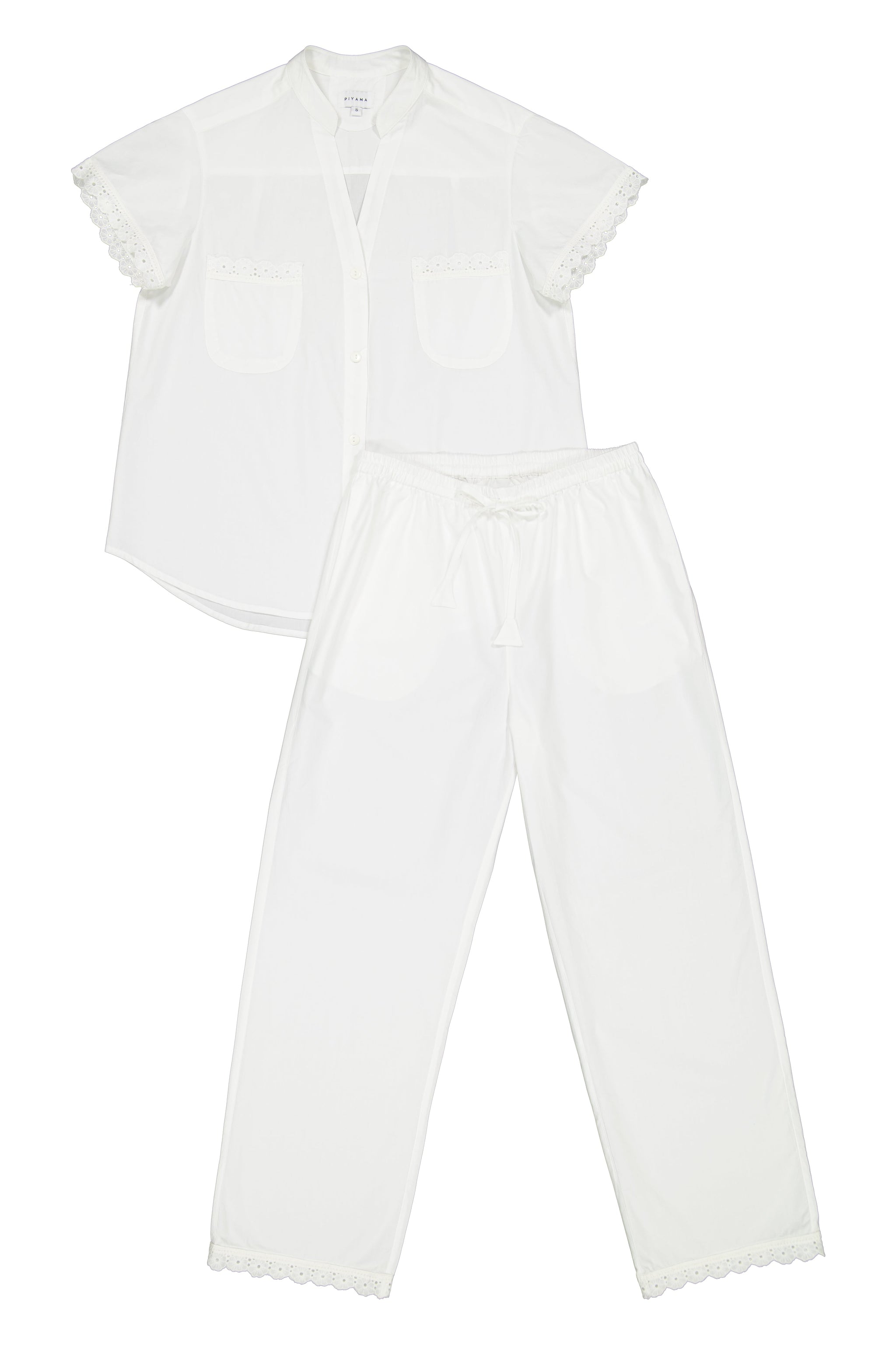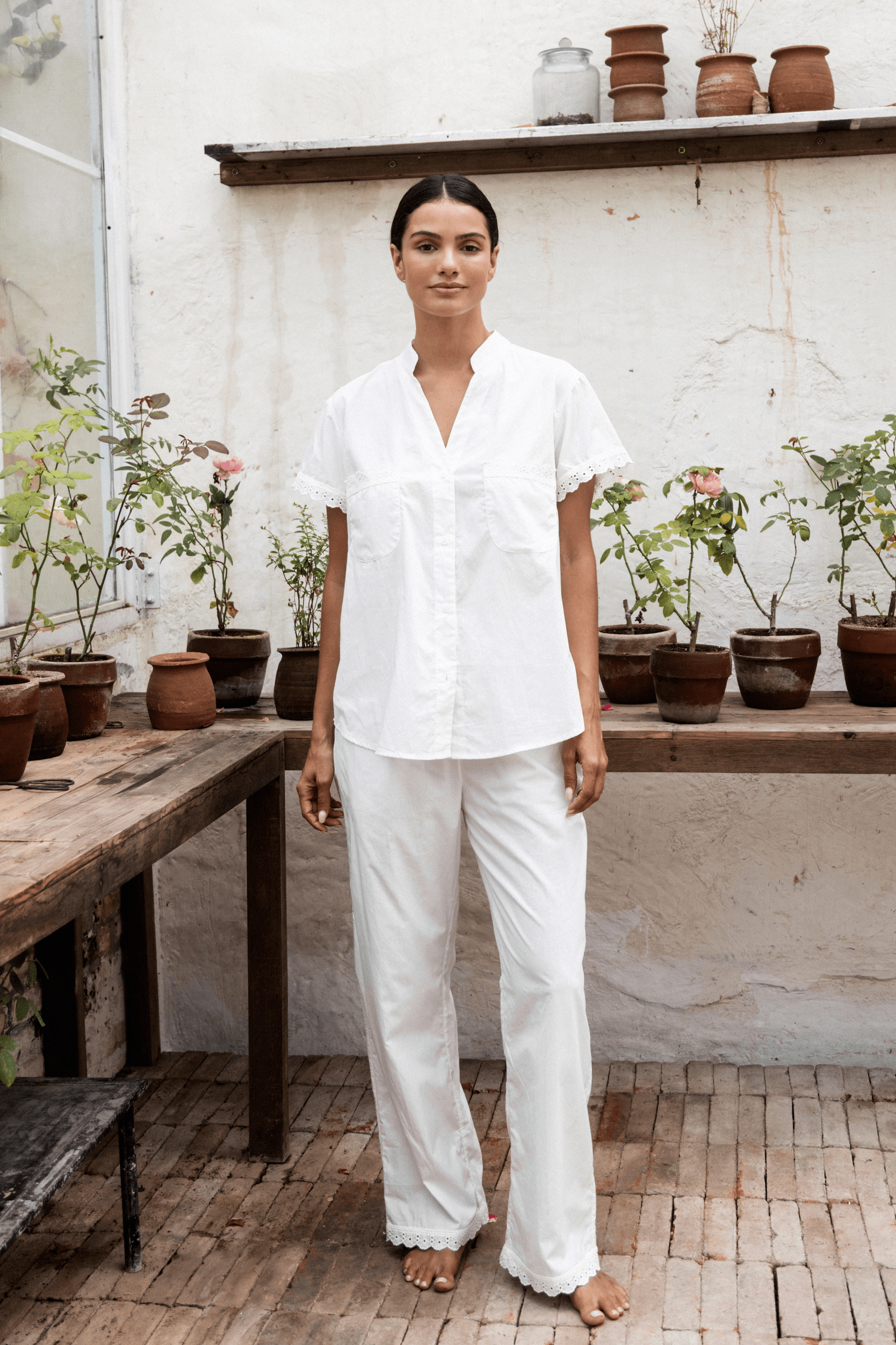 Maggie Pyjama Set - Long Pants - Off White Cotton Modal + Daisy Trim