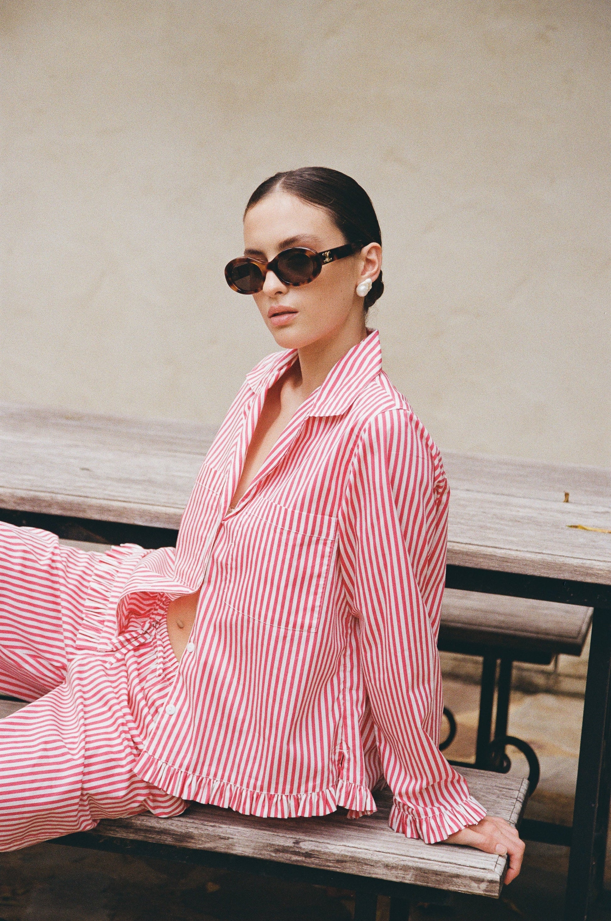 A charming blend of charm and comfort, the Felicity Frill Pajama Set offers a playful silhouette designed for the modern romantic. Timeless in a classic pinstripe.