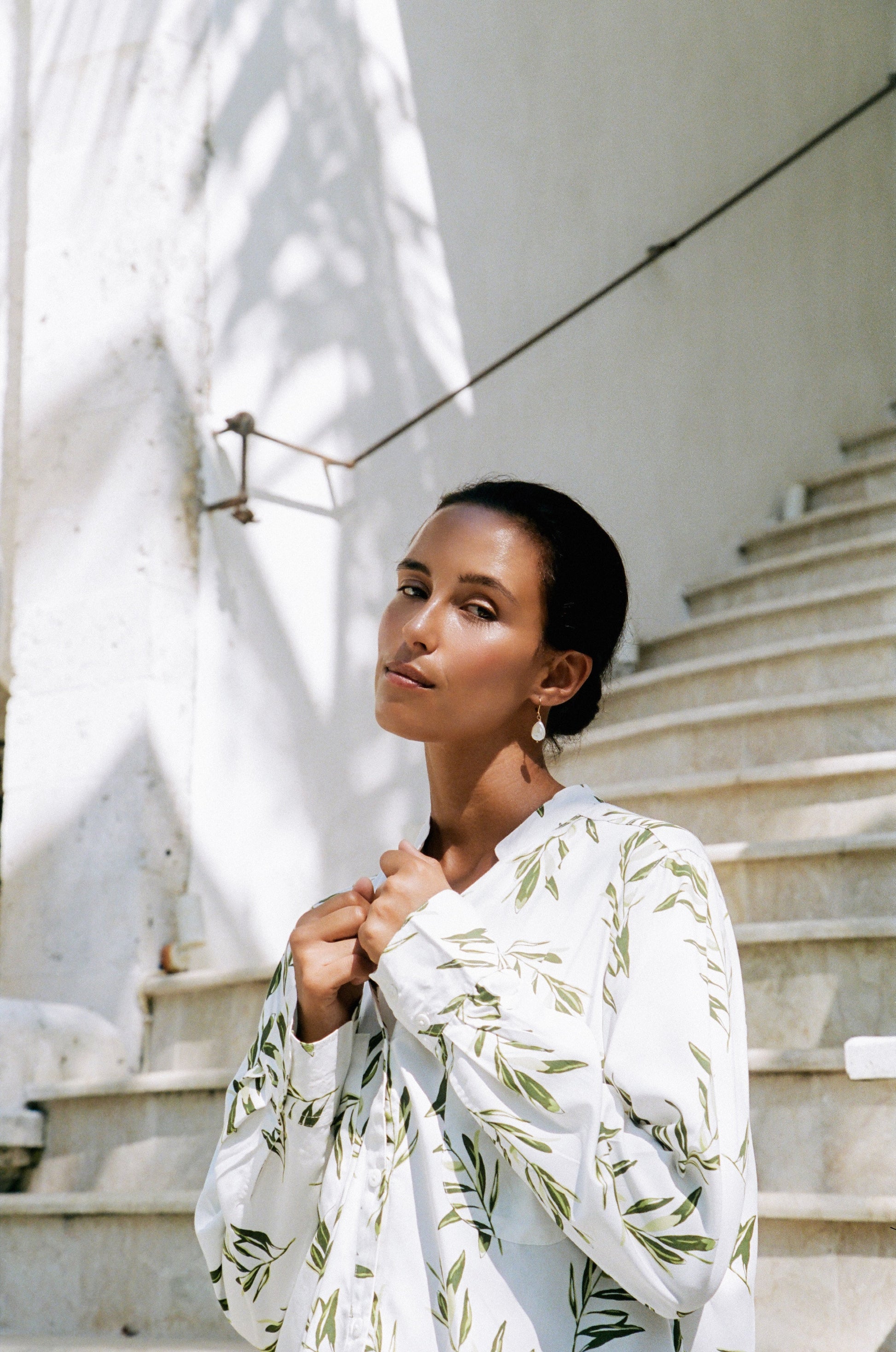 • Mandarin style collar and button down top, maternity friendly