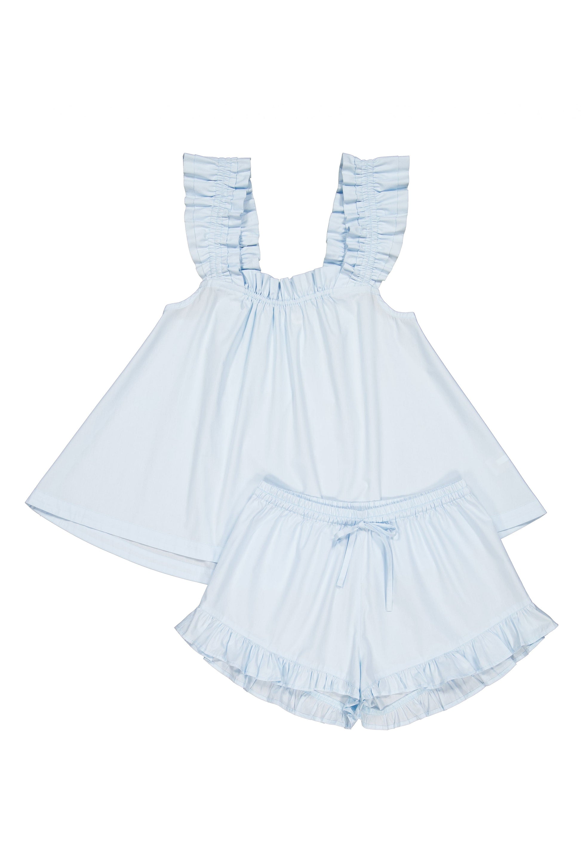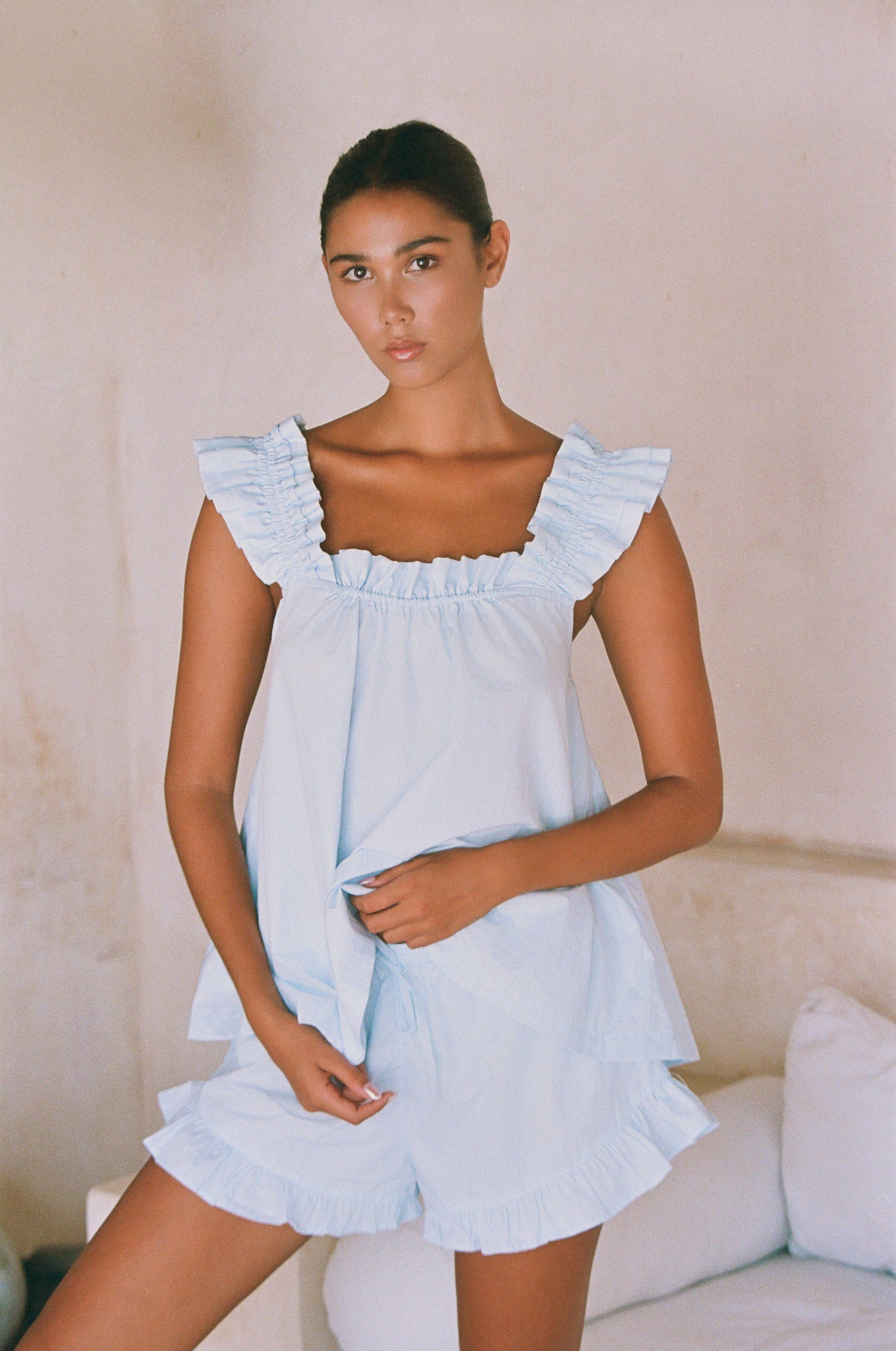 • Elastic drawstring shorts with side ruffles (no pockets)