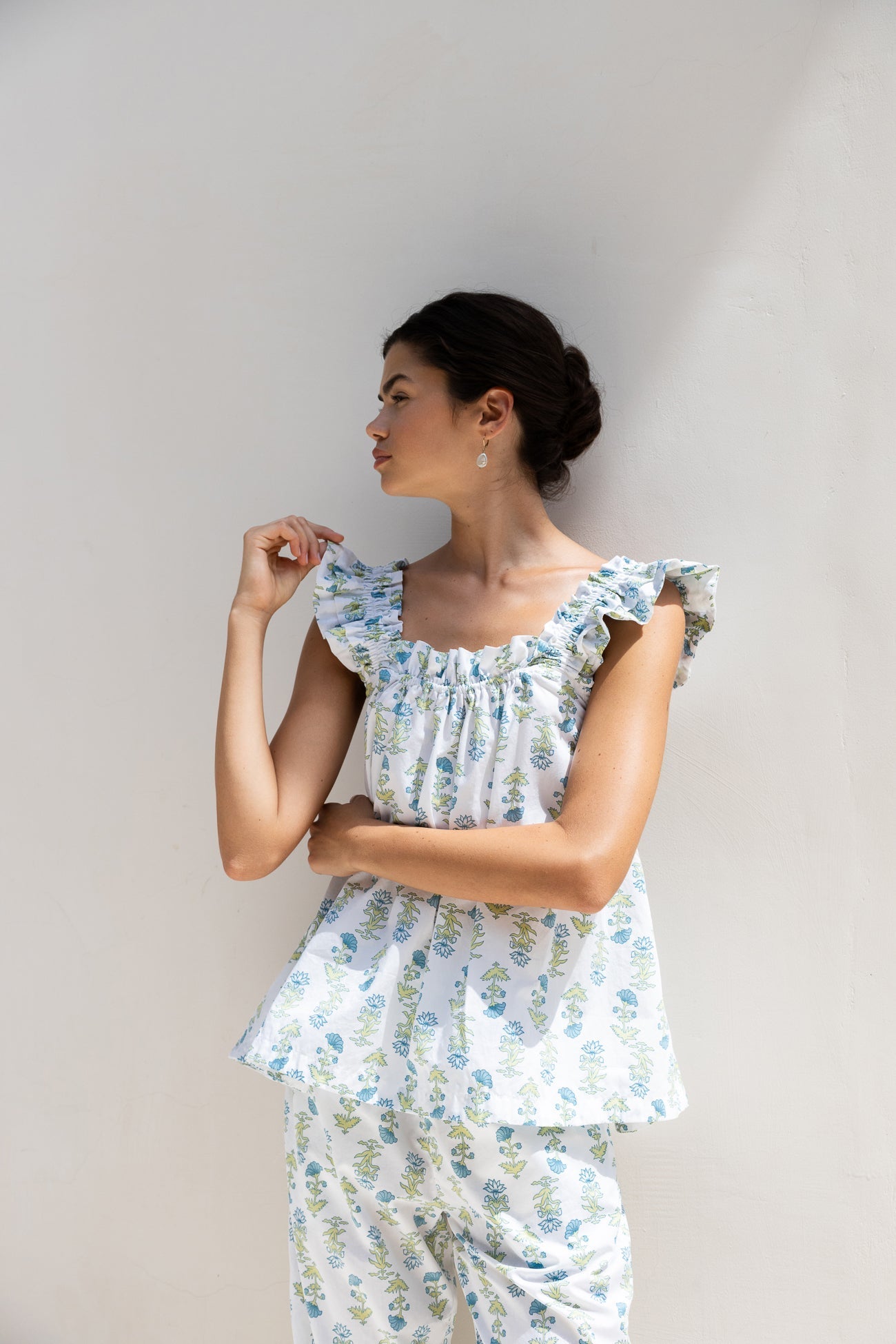 Nicolette Sleep Set - Pants - Cotton - Lotus Flower - Blue