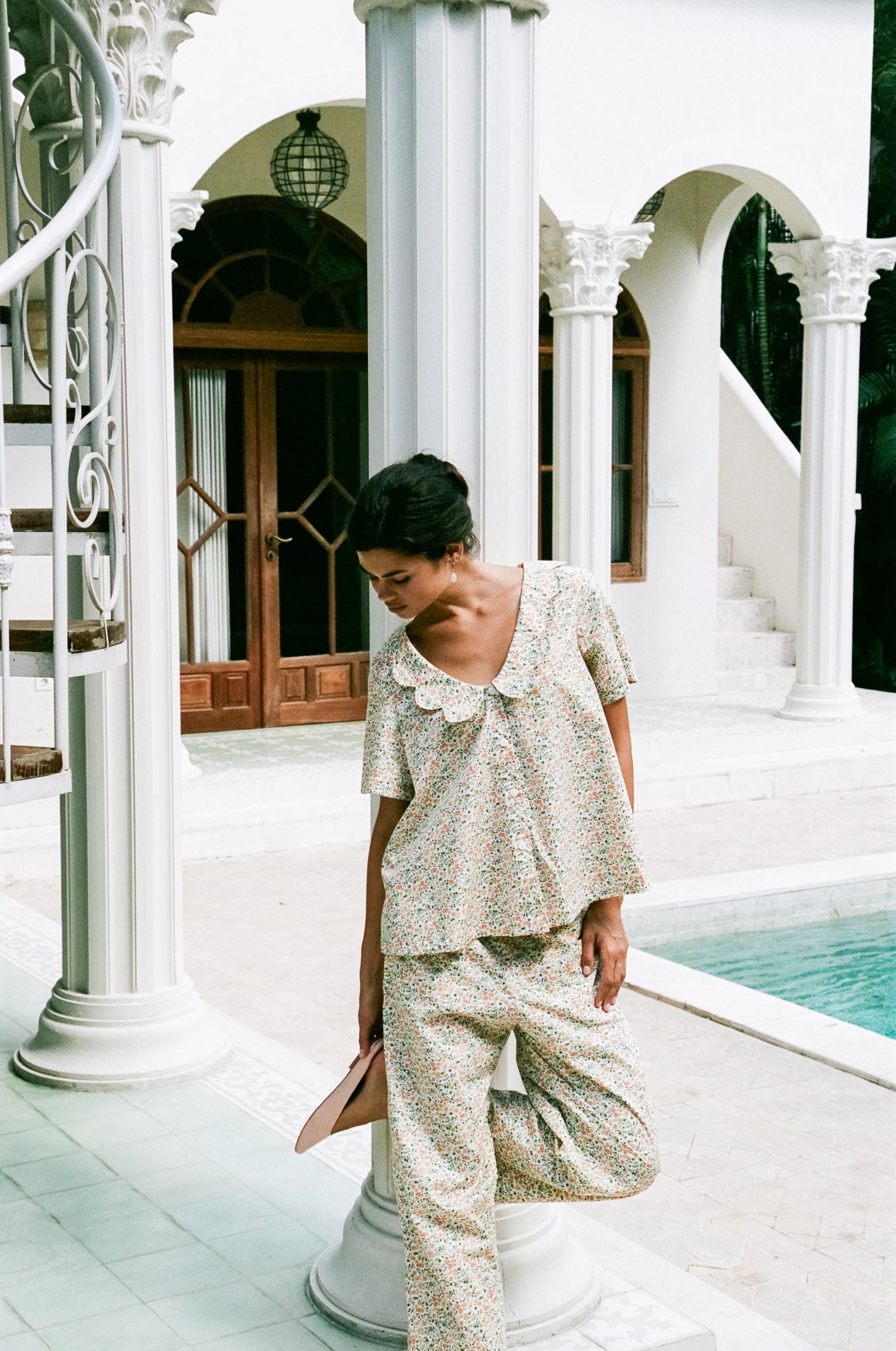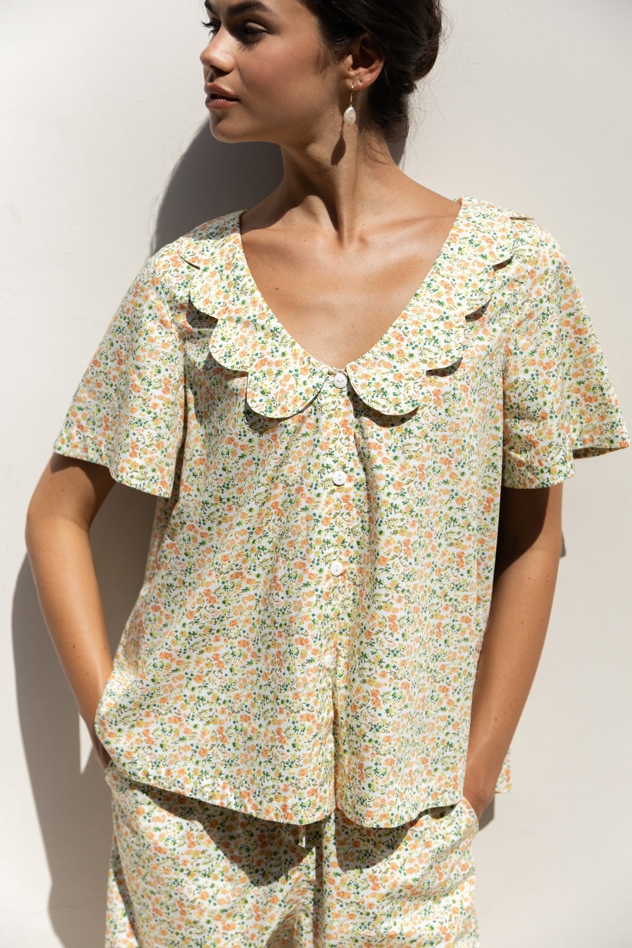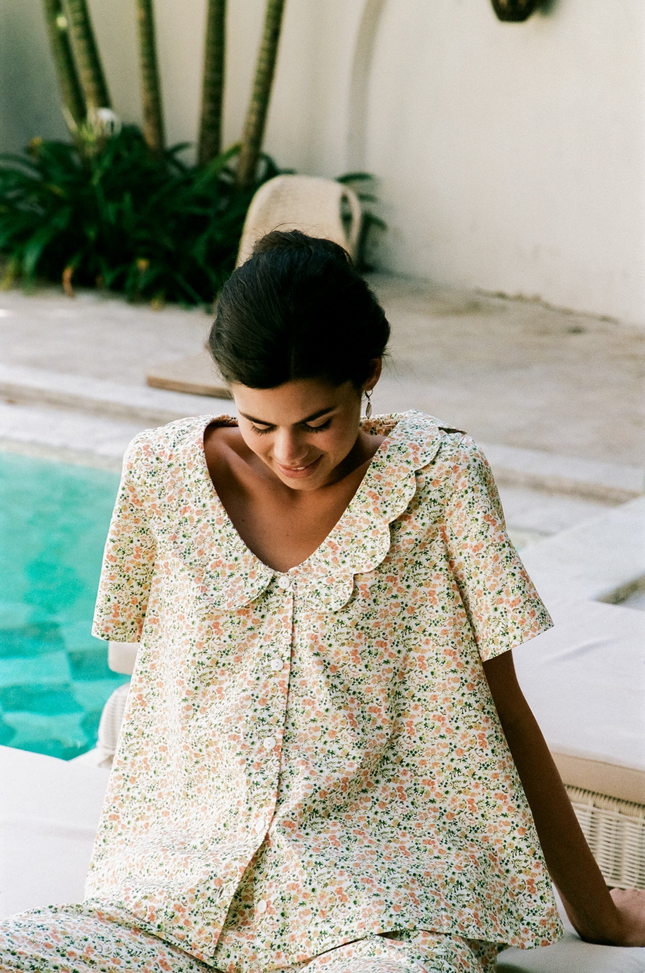 Our charming Penelope Set is perfect for lounging around the house, and looking chic while doing so. Crafted from premium cotton, and adorned with a Peter-Pan scalloped collar, this timeless ensemble will become a favorite.