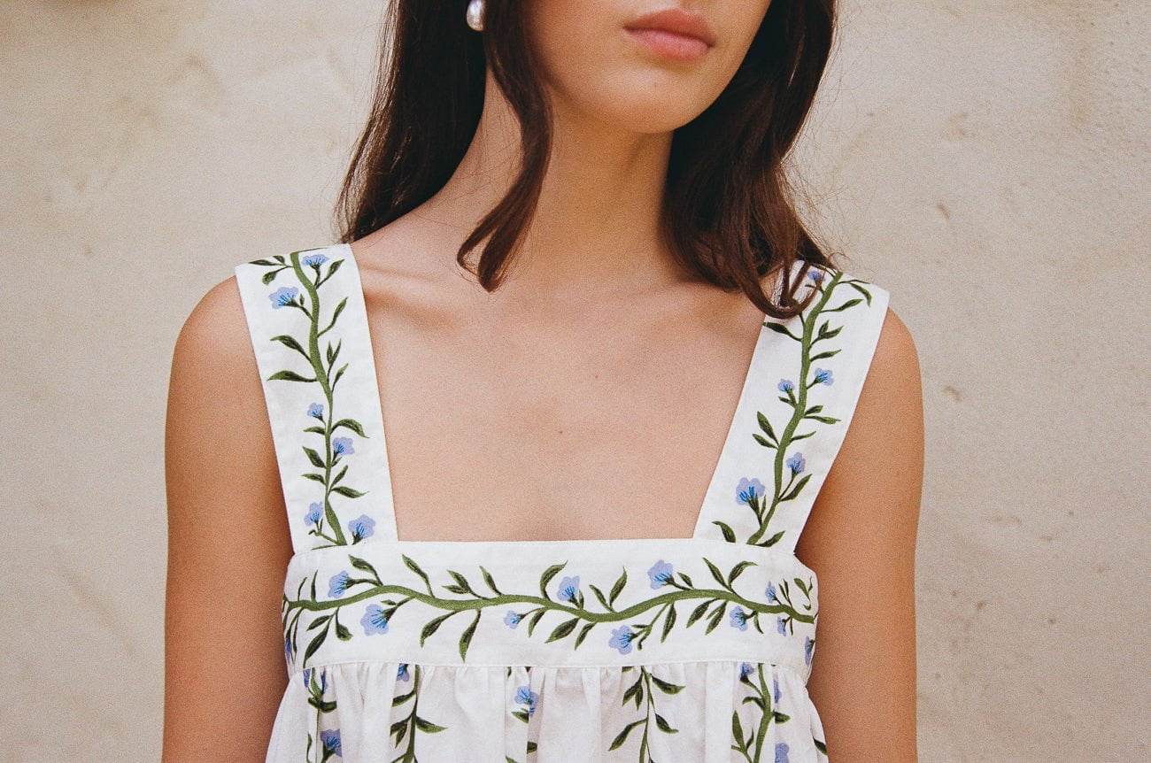 Our exciting new Cotton addition ‘Vine’ is an elegant blend of charm and comfort. Cut here in the Suzette Pajama Set, a summery two-piece, to be worn in the bedroom or beyond. Print designed in collaboration with talented creative @emilyisabella